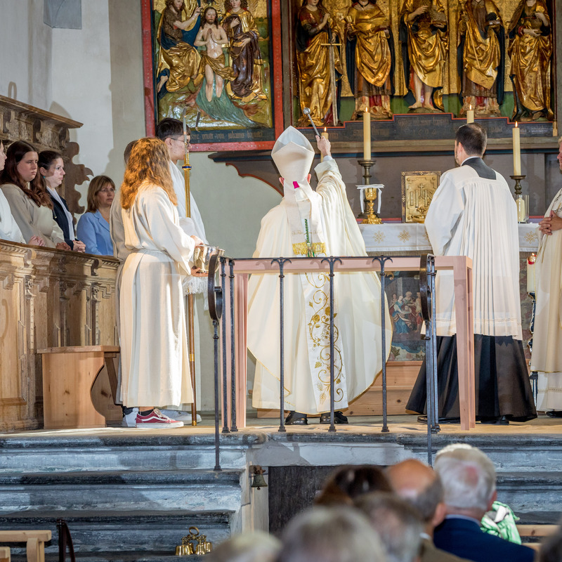 Am Samstagmorgen, 30. September 2023, weihte Bischof Joseph Maria Bonnemain die Kirche Sogn Gion im Rahmen einer stimmungsvollen und würdigen Feier ein. Die vielen positiven Gästekommentare sind ein Beleg dafür, dass das Generationenprojekt und mithin die Konservierung/Restaurierung der Anlage Sogn Gion in jeder Beziehung gelungen ist.